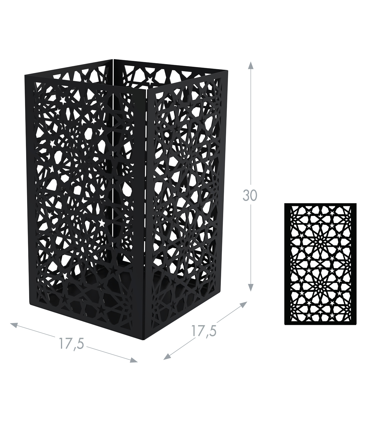 Verleihen Sie Ihrem Innen- oder Außenbereich eine warme Atmosphäre mit diesem quadratischen Windlicht aus schwarzem Metall. Mit seiner Höhe von 30 cm und seiner Breite von 17,5 cm ist es eine raffinierte und zeitgenössische Dekoration. Das lasergeschnittene Seerosenmotiv projiziert schöne dekorative Schatten, wenn die Kerze angezündet wird, und schafft so eine sanfte und beruhigende Atmosphäre. Aus robustem Epoxid-Metall gefertigt, ist dieses Windlicht langlebig und stabil und vereint Ästhetik und Solidität. Ideal zur Dekoration Ihres Hauses oder Ihrer Außenbereiche, verleiht es all Ihren Abenden eine designorientierte und poetische Note.